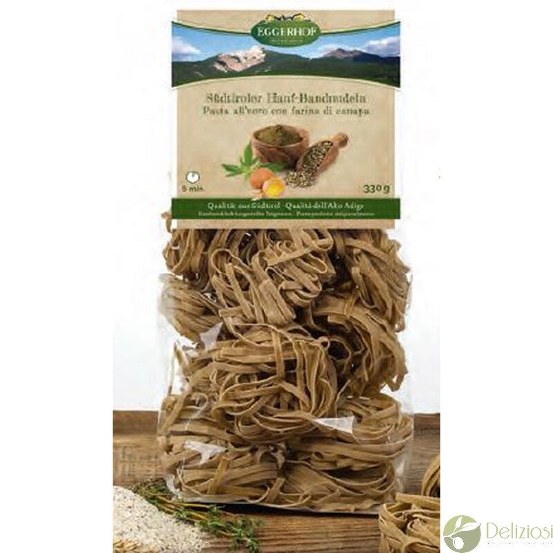 Zutaten: Hartweizengrieß, 33% frische Freilandeier, Hanfsamenmehl 15%, Hanfsamenöl 0,45% (nicht aus Südtirol).