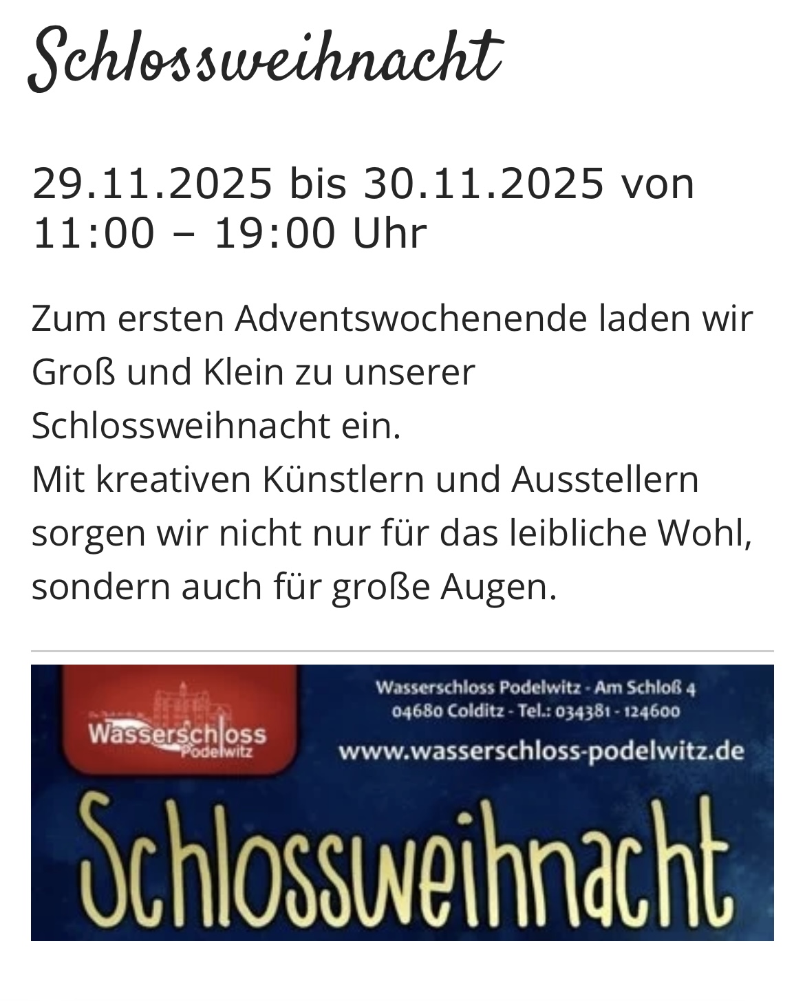 Schlossweihnacht Podelwitz 2025-11-26 14:17:59 2025-11-26 14:15:0026.11.2025 14:15 . Wochen und AbendmärkteBitte melden Sie sich an, um einen Kommentar zu schreiben.